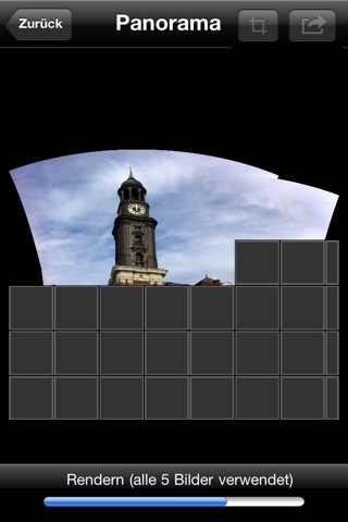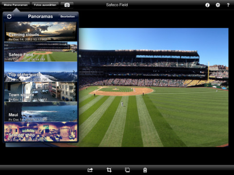 Das passende Panorama wird direkt in der App präsentiert, die unsauberen Ränder können automatisch abgeschnitten werden – oder aber man legt selbst Hand an, was aufgrund der Größe des Panoramas allerdings etwas fummelig werden kann. Das fertige Bild kann entweder in der Bibliothek abgespeichert, per E-Mail versendet oder auf Facebook hochgeladen werden.