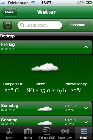 Im Gegensatz zur HD Version der Morgenpost, befindet sich in der iPhone-Version eine ausführliche Wettervorschau, sowie einen Liveticker für Sportevents. Durch Eingabe der Stadt erhält man die Wettervorhersage für die komplette Woche mit Anzeigen der Temperatur, der Windstärke und der Niederschlagswahrscheinlichkeit. Unter dem Menüpunkt Sport-Live gibt es Ergebnisse und Tabellen aus der Formel 1, der Fußball-Bundesliga und der Champions League. Außerdem gibt es zu aktuellen Fußball-Bundesliga-Spielen einen Live-Ticker, der minütlich aktualisiert wird, damit man kein Tor mehr verpasst.