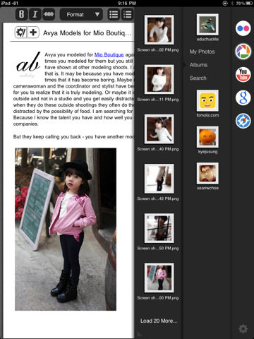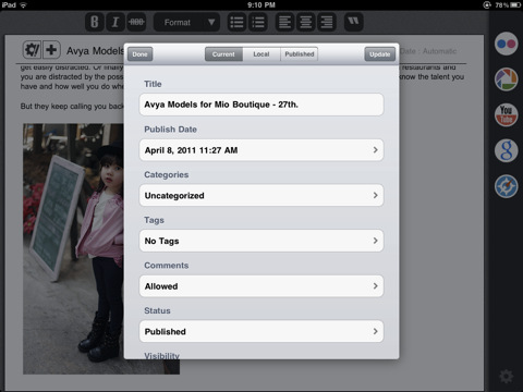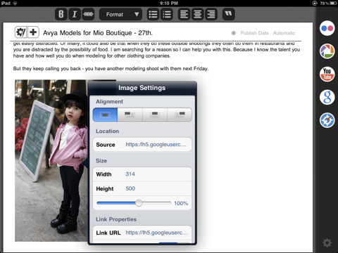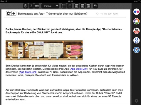Mit Blogsy kann man Artikel auch vom iPad aus editieren oder direkt neue schreiben. Bilder können über die Anbindung zu Flickr ganz einfach integriert werden, auch die Ausrichtung ist kein Problem. Via Drag&Drop kann das Bild frei platziert und kann im Nachhinein weiter editiert werden.