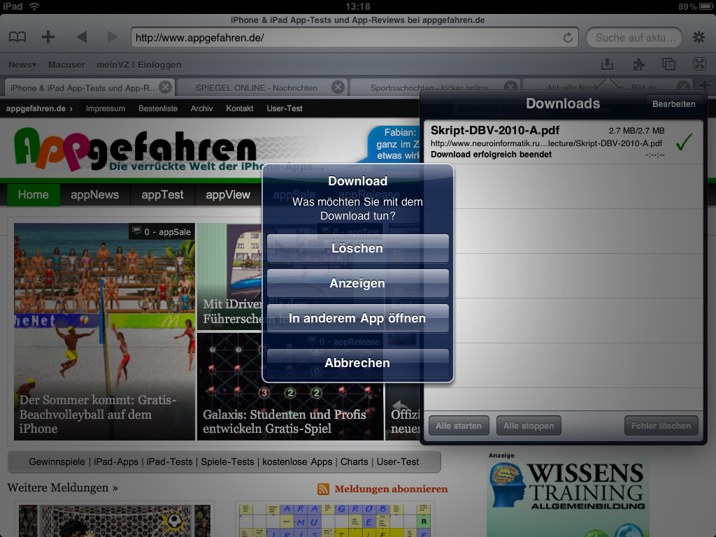 Ebenfalls sehr häufig kommt es vor, dass man Downloads tätigen will. Mit dem Safari schaut man in die Röhre, mit iCab Mobile ist das kein Problem. Man klickt einfach lange auf einen Link und wählt „Datei herunterladen“ aus, die dann direkt auf das iPad geladen wird. Ist der Download beendet, kann man die Datei entweder direkt anzeigen oder einfach in einer anderen App öffnen.