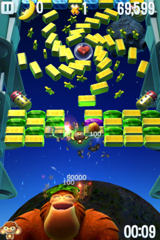 In den insgesamt 64 Leveln, die sich auf vier Welten verteilen, steuert ihr einen größeren Affen, der den kleinen Nachwuchs auf die Reise schickt. Im oberen Bereich des Bildschirms müssen Blöcke zerstört werden – genau wie es bei einem klassischen Brick Breaker der Fall ist.
