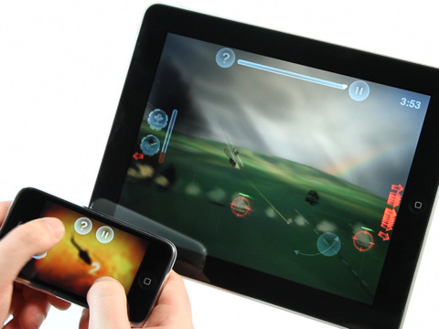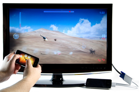 Hat man sich das 63 MB große Chopper 2 geladen und gleich auf zwei Geräten installiert, kann man zum Beispiel ein iPhone als Gamepad benutzen und das iPad mit dem passenden Kabel (Amazon-Link) an den Fernseher anschließen. Wie das ganze dann aussieht, seht ihr auf dem eingefügten Bild. Achtung: Das empfangende Gerät muss mindestens ein iPhone 4, iPod Touch 4G oder iPad sein.