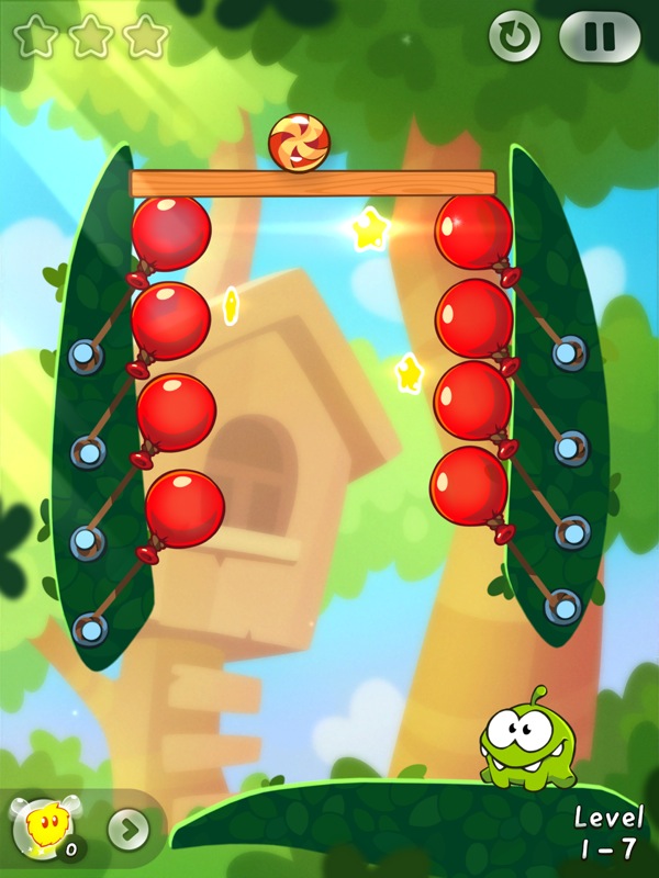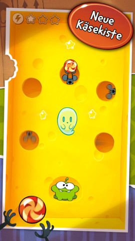 Der große Unterschied zu den bisherigen Ausgaben von Cut the Rope: Es gilt nicht einen Om Nom zu füttern, sondern gleich zwei. Om Nom, das ist ein kleines grünes Tierchen, der während der Zeitreise auf seine Vorfahren trifft, die ebenfalls sehr gefräßig sind. Durch das Zerschneiden von Seilen und die Interaktion mit verschiedenen Elementen muss man zwei im Level befindliche Süßigkeiten in das Maul der Om Noms befördern und auf dem Weg dorthin nach Möglichkeit alle drei Sterne aufsammeln.
