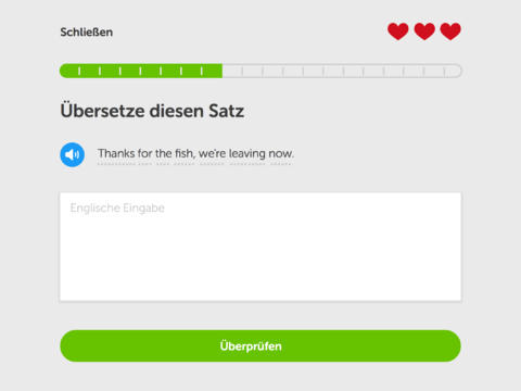 Mit Duolingo lässt sich Französisch, Spanisch, Italienisch, Portugiesisch und mehr lernen. Sind keine Vorkenntnisse vorhanden, bekommt man anfangs einige Basics präsentiert. So werden einige Wörter inklusive jeweiliger Bilder vorgestellt, dann muss man kleine Aufgaben erledigen. Zu diesen zählen etwa die Auswahl von korrekten Übersetzungen oder die Bildung von Begriffen aus vorgegebenen Textbausteinen. Ist Duolingo schon etwas länger im Einsatz, kann man gerne wieder von vorne starten und sein Wissen erneut auf die Probe stellen.