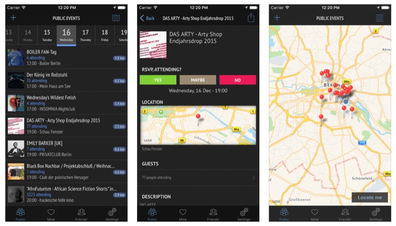 Mit EV3NTS, das ehemals als „Friend’s Events“ im App Store bekannt war, können Facebook-Veranstaltungen in der Nähe sowie solche, zu denen man eingeladen worden ist, eingesehen werden – auch Events von Freunden im sozialen Netzwerk werden unterstützt, sofern diese auch die EV3NTS-App nutzen. Die Anwendung unterstützt dabei auch die von Facebook bekannte Rückmeldungs-Option „Teilnehmen“, „Absagen“ und „Vielleicht“, um Veranstalter zu informieren.