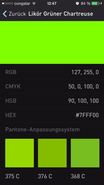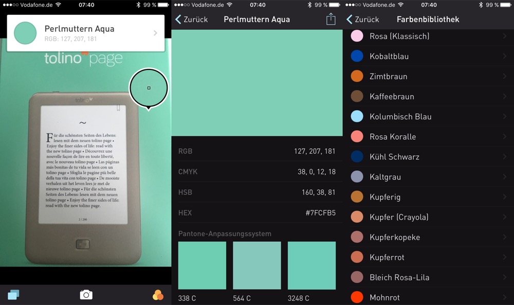 Außerdem kann man mit wenigen Klicks aus einem Foto die Hauptfarben selektieren und dessen Farbcodes herausfinden. Hier können durch drücken des Plus-Buttons weitere Farben hinzugefügt werden, indem man mit einer Lupe über den Bereich fährt, der erkannt werden soll. Natürlich kann man auch ein Foto direkt mit der Kamera aufnehmen und die Farbwerte auslesen lassen.