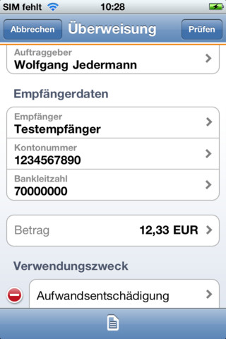 Für Kunden der Volksbank Raiffeisenbank gibt es dafür noch ein paar nützliche Features. Neben Vorlagen für Überweisungen hat man außerdem Zugriff auf ein Kontaktsystem zur Bank, eine Geldautomatensuche und die Sperrhotline. Klasse hat uns gefallen, dass man auf die beiden letztgenannten Funktionen zugreifen kann, ohne das Anmeldepasswort einzutippen. Wenn man nur mal eben auf der Suche nach einem VR-Geldautomaten ist, spart man so etwas Zeit.