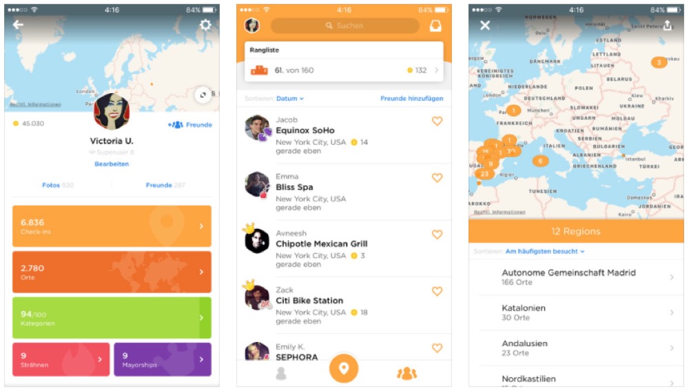 Ab sofort präsentiert sich Foursquare im aufgehübschten Layout, das jetzt natürlich an die Gegebenheiten von iOS 7 angepasst wurde. Nun basiert das Layout auf den Eigenschaften flach, schnell und große Schaltflächen. Das Redesign ist auf jeden Fall gelungen, anfangs allerdings etwas gewöhnungsbedürftig.