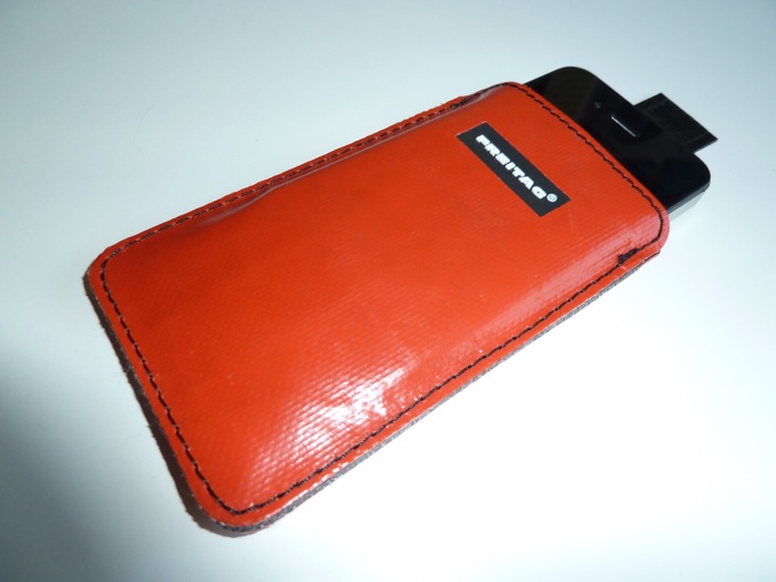 F24 iPhone Sleeve: Die 43 Euro teure iPhone-Hülle ist in vielen verschiedenen Farben und meist ohne Muster erhältlich. Auf der Vorderseite ist ein Logo der Firma Freitag eingebunden, auf der Rückseite gibt es eine Schlaufe zum Herausziehen des iPhones aus der eng anliegenden Hülle.
