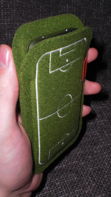 Das iPhone, in unserem Fall das 4er-Modell, passt haargenau in die Hülle und kann mit etwas Druck hereingeschoben und herausgezogen werden. Die enge Passform hat einen großen Vorteil: Holt man das Sleeve mit der Öffnung nach unten aus der Tasche, bleibt das iPhone sicher an Ort und Stelle – ich spreche da aus Erfahrung…