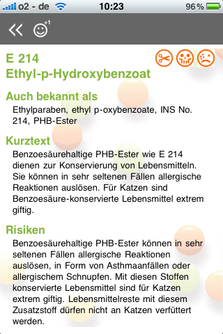 Mit einem Klick auf einen der wilden Namen öffnet sich eine detaillierte Informationsseite, in der alles wissenswerte rund um den Zusatzstoff verständlich dargestellt wird. Worunter ist der Stoff noch bekannt, wofür wird er benutzt und wie ist sein chemischer Name – sind nur einige der interessanten Punkte. Nützlich ist auch die Anzeige verschiedener Warnsymbole, die auf den ersten Blick wichtige Eigenschaften verdeutlicht.
