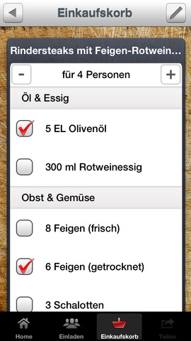 Das Menü der App ist sehr übersichtlich gestaltet: hier findet man eine lange Liste mit Kategorien (z.B. Beilagen, Brot, Ente, Gemüse…), die sich auch noch in Regionen (z.B. Asien, Australien, Bayern, Deutschland etc.), Zubereitung (Backofen, Bratpfanne, Drehspieß, Grillen/Kochen, Mikrowelle usw.) oder Hauptzutat (Ananassaft, Beefsteaks, Estragon, Farfalle…) aufteilen lassen. Das Ganze ist im modernen, aber rustikalen Layout gehalten, auch eine Suchfunktion für die einzelnen Kategorien gibt es.