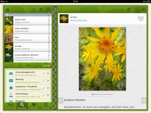 Die jeweiligen Einträge lassen sich ganz einfach in einer Gesamtliste ansehen, aber auch zur Bestimmung nach verschiedenen Merkmalen wie Blütenfarbe, Wuchshöhe, Blütezeit oder Standort aufschlüsseln. Anhand der gemachten Vorschläge lässt sich die Art dann schnell bestimmen. Auch gibt es die Möglichkeit, nach verschiedenen Krankheitssymptomen, Anwendungsbereichen und Wirkung eine passende Heilpflanze zu finden.