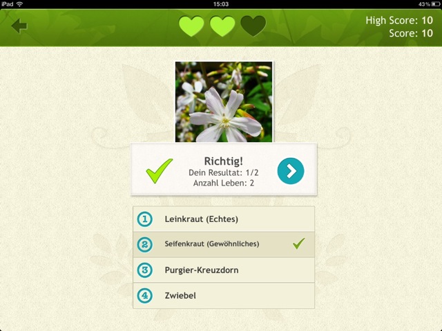 Mit einem integrierten Quiz können die verfügbaren Pflanzen weiter verinnerlicht werden. Dazu steht jeweils ein Bild und vier verschiedene Antwortmöglichkeiten zur Auswahl. Insgesamt verfügt man über drei Fehlversuche, jede richtige Antwort bringt 10 Punkte. Die Highscores können auf Facebook geteilt oder bei OpenFeint veröffentlicht werden.