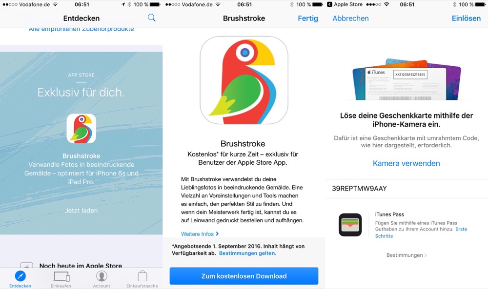 In der Apple Store-App (App Store-Link) verschenkt Apple die Foto-App Brushstroke, mit der man seine eigenen Bilder in Gemälde umwandeln kann. Insgesamt gibt es 38 Malstile, die individuell eingestellt werden können. Wie ihr den sonst 4,99 Euro teuren Download kostenlos bekommt, entnehmt bitte dieser Anleitung.