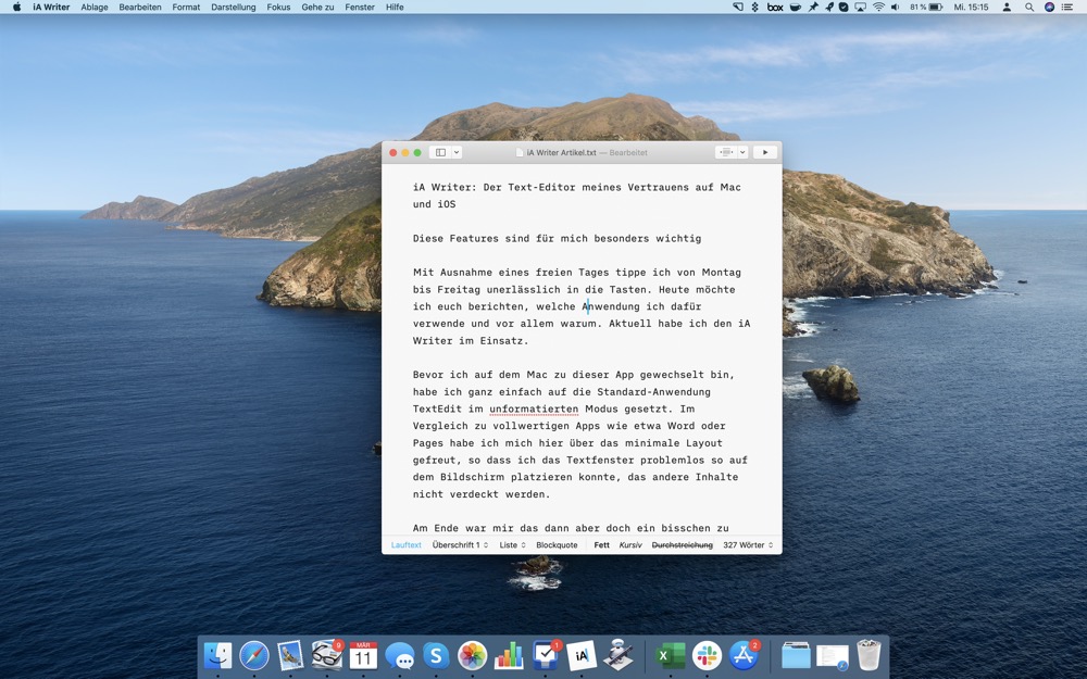 Im Gegensatz zu anderen Texteditoren beschränkt sich iA Writer wirklich auf das absolut wesentliche, nämlich auf den Text. Wer nicht von Leisten, Bannern oder sonstigem Menüs abgelenkt werden will, sollte sich die reduzierte Mac-App auf jeden Fall genauer ansehen.