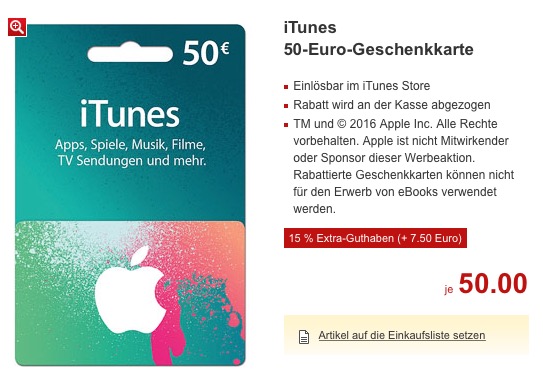 Ich kann mich nicht daran erinnern, wann ich zum letzten Mal eine iTunes-Karte zum regulären Preis gekauft und weder einen Rabatt, noch einen Bonus erhalten habe. Zwar hat Apple, das für quasi alle dieser Aktionen verantwortlich ist, die Ersparnis in den letzten Jahren immer weiter zurück geschraubt, letztlich ist wenig Rabatt aber immer noch besser als gar keiner.