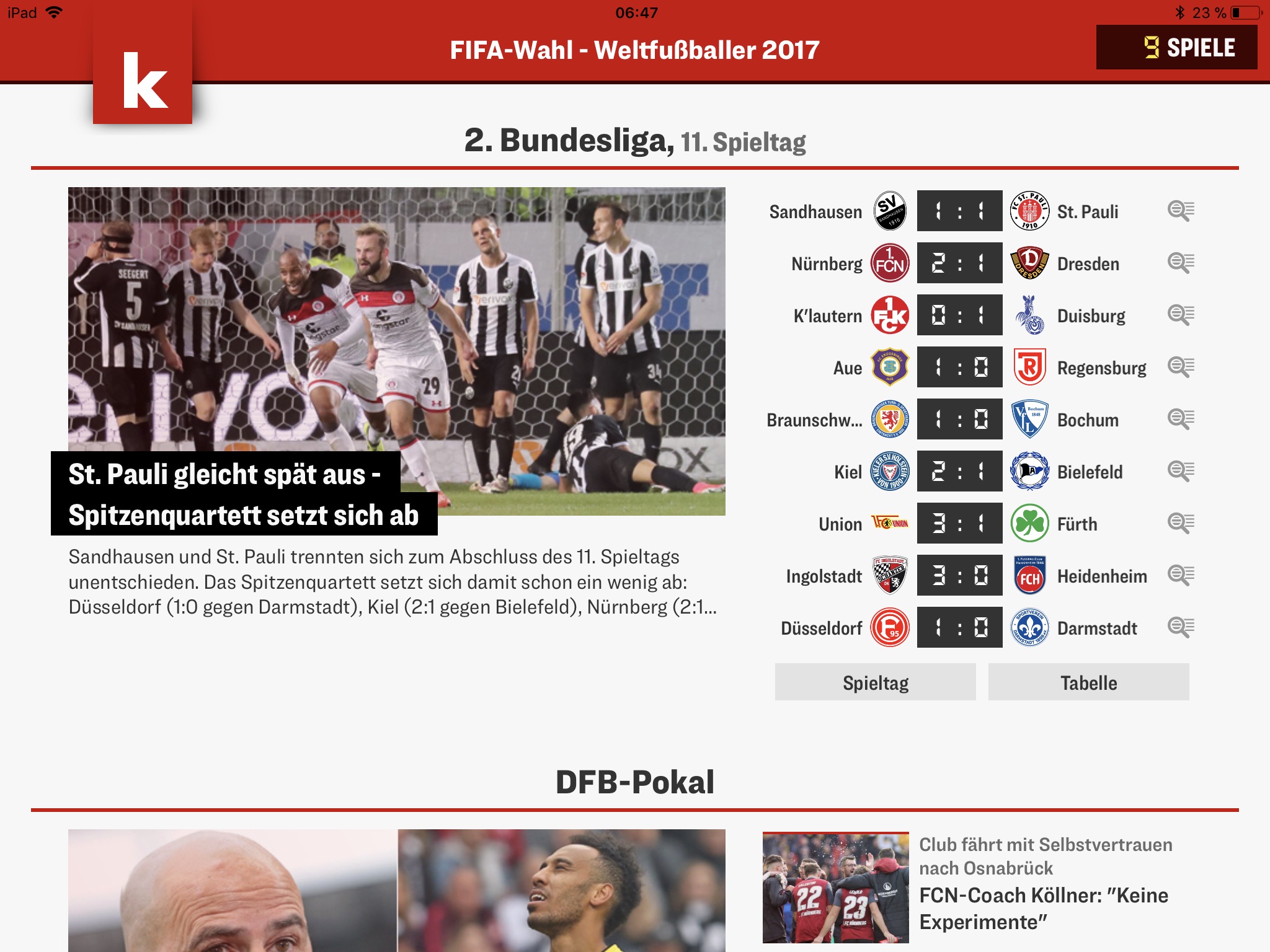 Kicker: Bereits Anfang des Monats hat der Kicker in einer speziell angepassten iPad-Version den App Store erreicht. Das hat mich besonders gefreut, denn auf die Sportschau-App warten wir ja bisher vergeblich. Die Menüführung hat man schnell verinnerlicht, die Inhalte sind ohnehin top. Für jeden Sportfan ist dieses Angebot daher schon fast ein Muss. (kostenlos, iPad).