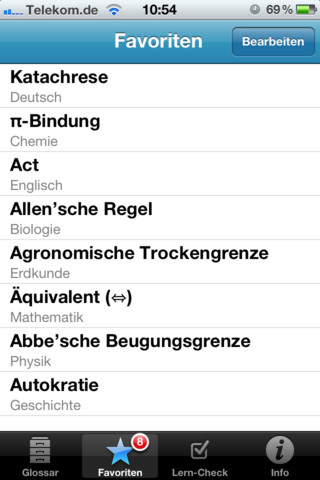 Die Ansicht der einzelnen Karteikarten ist gut gemacht. Im Querformat sieht man zunächst die Vorderseite mit dem gesuchten Begriff, wischt man mit dem Finger nach links oder rechts, bekommt man die Definition gezeigt. Streicht man nach oben oder unten, wechselt man die Karte – schüttelt man das iPhone, werden alle Begriffe neu gemischt.