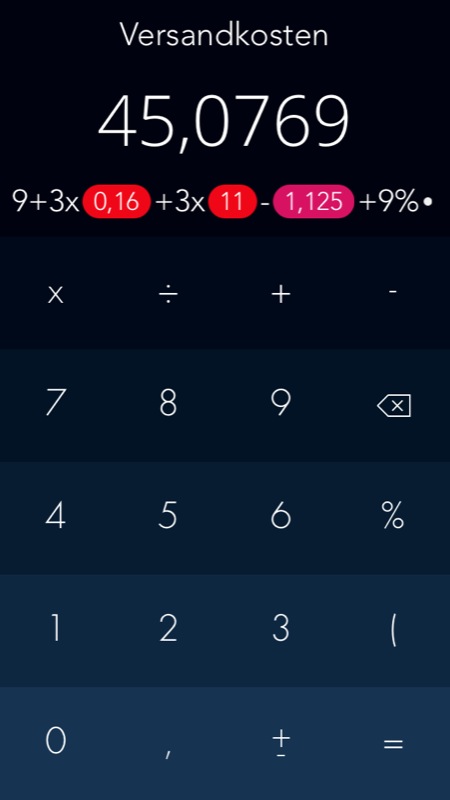 Mit Luna werden euch ein paar Zusatzfunktionen geboten, die der Apple-Rechner nicht bieten kann. Bei der Eingabe werden alle Rechenoperation in dem Textfeld angezeigt, durch farbige Hervorhebungen wird auf Zwischenrechnungen aufmerksam gemacht. Wollt ihr beispielsweise (6-3+9)*5 rechnen, wird das Ergebnis in der Klammer sofort und in Echtzeit berechnet und angezeigt.