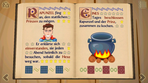Alle Bücher erzählen das jeweilige Märchen und bieten nebenbei noch ein paar kleine Mini-Spiele, mit denen sich die Kinder einige Minuten beschäftigen können, bevor zur nächsten Seite umgeblättert wird. Abgesehen von Rumpelstilzchen sind alle drei Bücher mit sehr guten viereinhalb Sternen bewertet und kindgerecht umgesetzt – es wird zum Beispiel auf soziale Schaltflächen im Hauptmenü verzichtet.