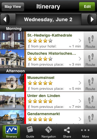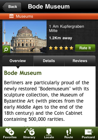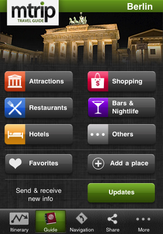 mTrip Berlin ist der einzige Reiseführer mit automatischer und personalisierter Reiseführung. So kann man aus der Datenbank das eigene Hotel aussuchen und sich von dort aus eine optimale Reiseroute anzeigen lassen. Es stehen sehr viele Einstellmöglichkeiten zur Verfügung. So kann man sich zum Beispiel nur Museen oder die wichtigsten Sehenswürdigkeiten anzeigen lassen.