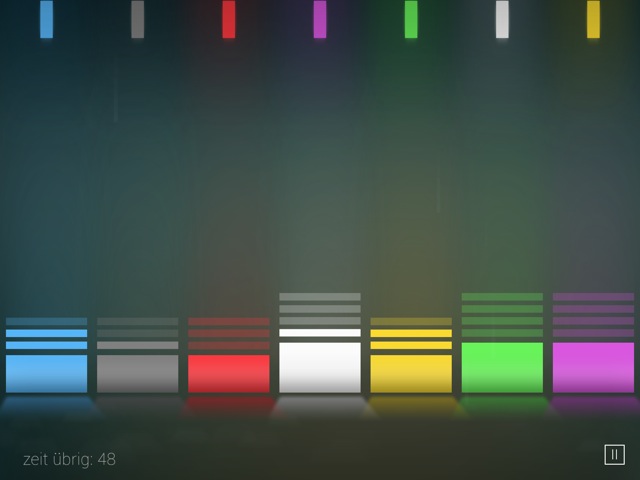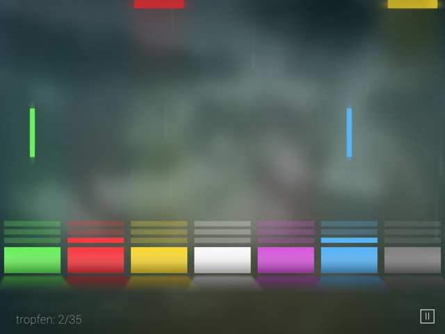 And Then It Rained steht bereits in deutscher Sprache bereit, auch wenn die Beschreibung im App Store es anders vermuten lässt. In insgesamt 40 Leveln mit stetig ansteigendem Schwierigkeitsgrad muss man sein Können im Fangen von bunten Regentropfen unter Beweis stellen, die in farblich passenden Behältern am unteren Bildrand gesammelt werden müssen und sich so nach und nach mit Inhalt füllen. Verfehlt man den jeweiligen Behälter, wird der Inhalt des falsch gewählten langsam reduziert: Indikatoren in Form von kleinen Balken zeigen an, wie viel Inhalt noch vorhanden ist.