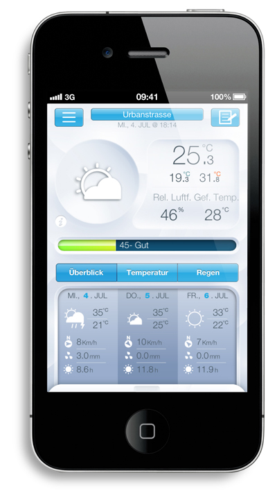 Zunächst gilt es natürlich, die zwei Messgeräte für innen und außen zu installieren. Das Innenmodul wird per USB mit dem iPhone oder iPad verbunden und zieht sich über die deutschsprachige Netatmo-App alle notwendigen Informationen, um sich mit dem WLAN zu verbinden. Das Außenmodel wird einfach mit Batterien versorgt und dann zum Beispiel auf dem Balkon angebracht (eine entsprechende Schlaufe oder ein Dübel mit Schraube liegen bei).