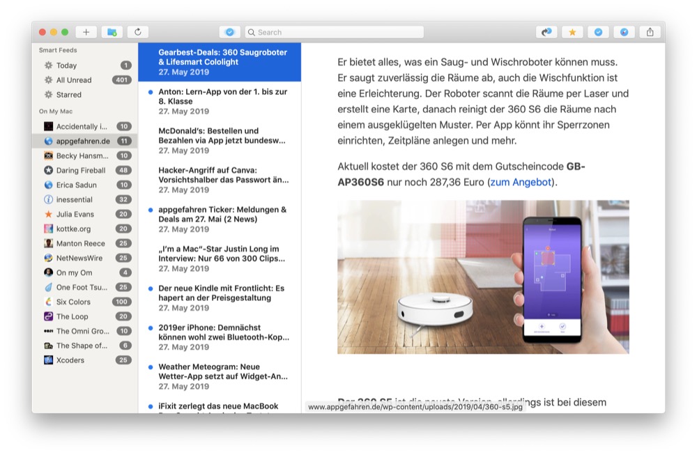 NetNewsWire macht ansonsten einen modernen und aufgeräumten Eindruck und bringt bekannte Funktionen mit, die einen RSS-Reader ausmachen. So könnt ihr natürlich durch alle Nachrichten scrollen, diese öffnen und lesen oder auch in einer Art Reader-Ansicht öffnen, in der alle Werbebanner und Co. ausgeblendet werden. Außerdem lassen sich einzelne Nachrichten als Favorit markieren und gesondert abrufen, auch könnt ihr neue Portale aus einer Vorauswahl hinzufügen, wobei hier eher ameikanische Webseiten vorgeschlagen werden.