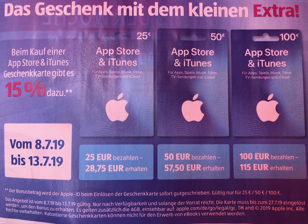 Update am 27. November: Der Vollständigkeit halber möchten wir noch das Angebot von EDEKA nachtragen. Dort gibt es 10 Prozent Rabatt auf die 25 und 50 Euro iTunes-Karte. Bei EDEKA sind die Angebote oft nur regional, prüft vor dem Kauf bitte, ob euer Markt an der Aktion teilnimmt.