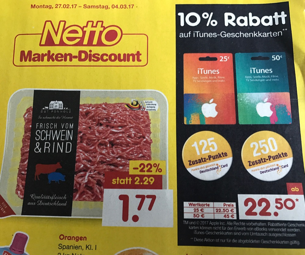 Im Gegensatz zu den vergangenen Aktionen bei Netto, bei denen man zum Kauf einer iTunes-Karte im Wert von 25 Euro einen Bonus von 5 Euro als Coupon bekam, gibt es jetzt wieder echte 20 Prozent Rabatt – an der Kasse zahlt ihr also nur 20 Euro.