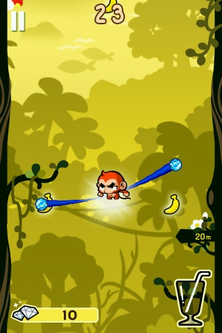 Ziel des Spiels ist es, einen kleinen Affen möglichst hoch in die Lüfte zu katapultieren und auf dem Weg einige Boni wie Diamanten oder Bananen einzusammeln. Wer schon einmal Doodle Jump oder auch Mega Jump gespielt hat, wird sich sicher schnell zurechtfinden. Das Besondere des Spiels ist jedoch die Art und Weise, WIE der Affe seinen Weg nach oben sucht: Mittels eines waagerechten Wisches über den Screen wird eine Art Trampolin aufgebaut, auf das der Affe aufspringt und nach oben schnellt. Je nach Ausrichtung des Wisches kann das Äffchen auch in bestimmte Richtungen hüpfen. Verfehlt das Tier das Trampolin oder ist man nicht schnell genug, ist das Spiel vorbei.