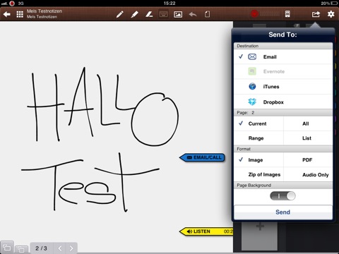 Leider kann das Eintragen von Text, genauso wie die Nutzung der gesamten App, nur im Hochformat erfolgen – was natürlich für eine schnelle Eingabe auf dem iPad etwas hinderlich ist. Dafür verfügt Pad & Quill aber auch über eine Weiterleitung der Notizen per E-Mail, eine Notiz-Recovery-Funktion, sowie über eine Synchronisations-Möglichkeit über das eigene iCloud-Konto. In meinem Fall funktionierte dieser Sync zwischen iPad und iPhone schnell und problemlos.