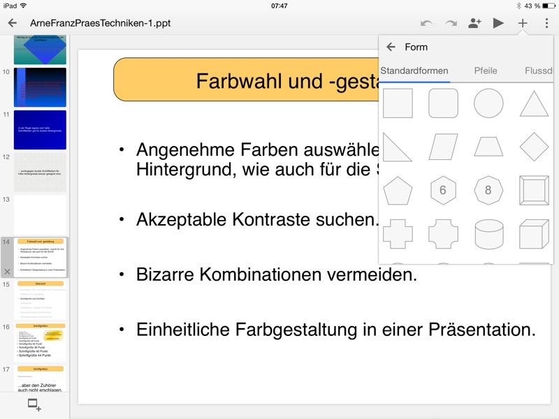Jeder, der sich ein neues iPhone oder iPad kauft, bekommt von Apple eine Office-Suite gratis dazu. Keynote, Numbers und Pages sind eine feine Sache, kommen bei mir aber nur gelegentlich zum Einsatz. Umso mehr könnte ich mich darüber ärgern, dass durch die vielen integrierten Vorlagen (die ja eigentlich zu loben sind) sehr viel Speicherplatz belegt wird. Wer das genau so sieht und trotzdem unterwegs Powerpoint-Dateien bearbeiten oder sogar erstellen will, sollte einen Blick auf Google Präsentationen (App Store-Link) werfen.