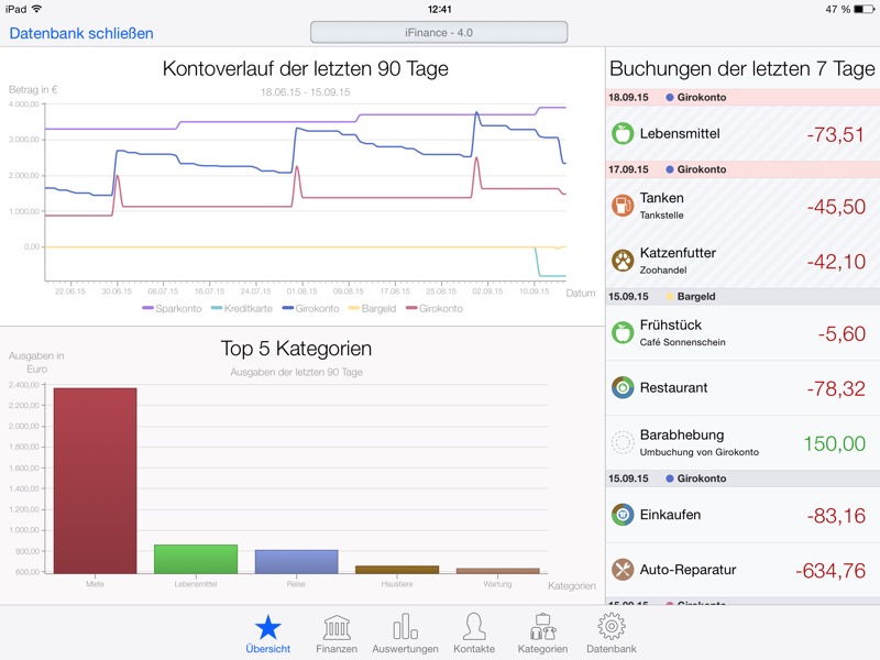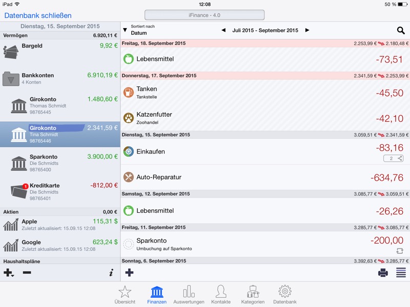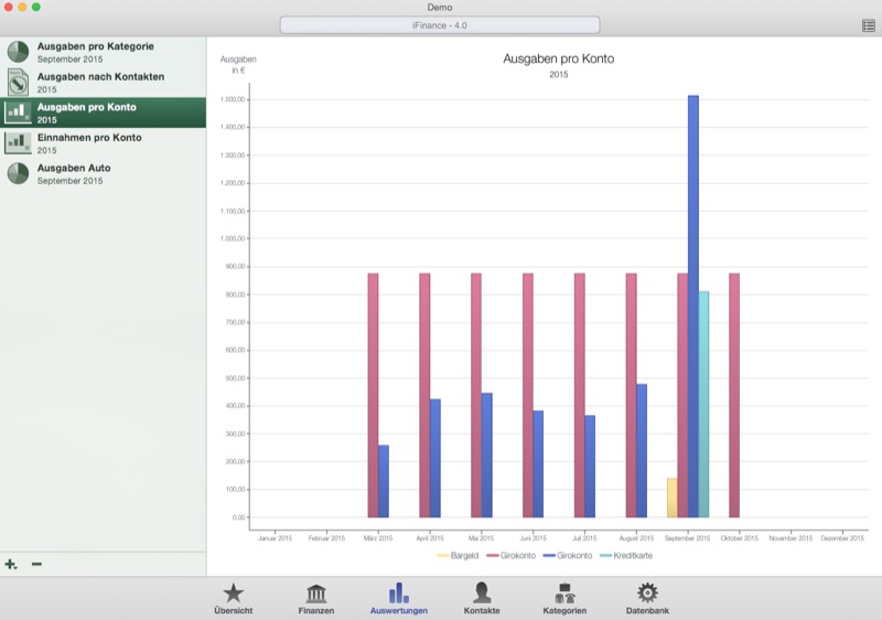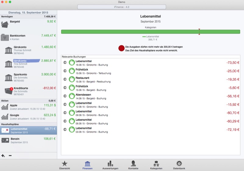 Das aus deutscher Entwicklung stammende iFinance 4 sieht sich als umfangreiche Lösung zur Finanzverwaltung inklusive Online-Banking, der Verwaltung von mehreren Datenbanken mit eingepflegten Konten, Aktien, Auswertungs- und Statistik-Möglichkeiten, eigenen Kategorien, Kontakten und Haushaltsplänen. „Lassen Sie iFinance 4 ihre Finanzen analysieren und sehen Sie dann sofort, was Ihre größten Ausgaben sind und wo sich Sparpotential befindet“, heißt es so auch in der Mac App Store-Beschreibung.