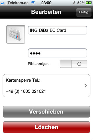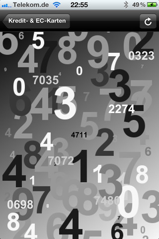 Danach kann man seine Daten hinterlegen. In iPIN können natürlich Passwörter für EC-Karten, Accountdaten und weitere Zahlenkombinationen eingetragen werden. Hier ist eine Gruppierung in verschiedene Unterordner möglich. Besonders gut gelöst ist die Anzeige der Daten. Möchte man sein Passwort nachsehen, wird ein großes Zahlenfeld angezeigt, welches in der Mitte das Passwort/PIN anzeigt, die aber nach einigen Sekunden wieder verschwindet. Mit dieser Art der Anzeige verhindert man es, dass Fremde einen Blick erhaschen können.