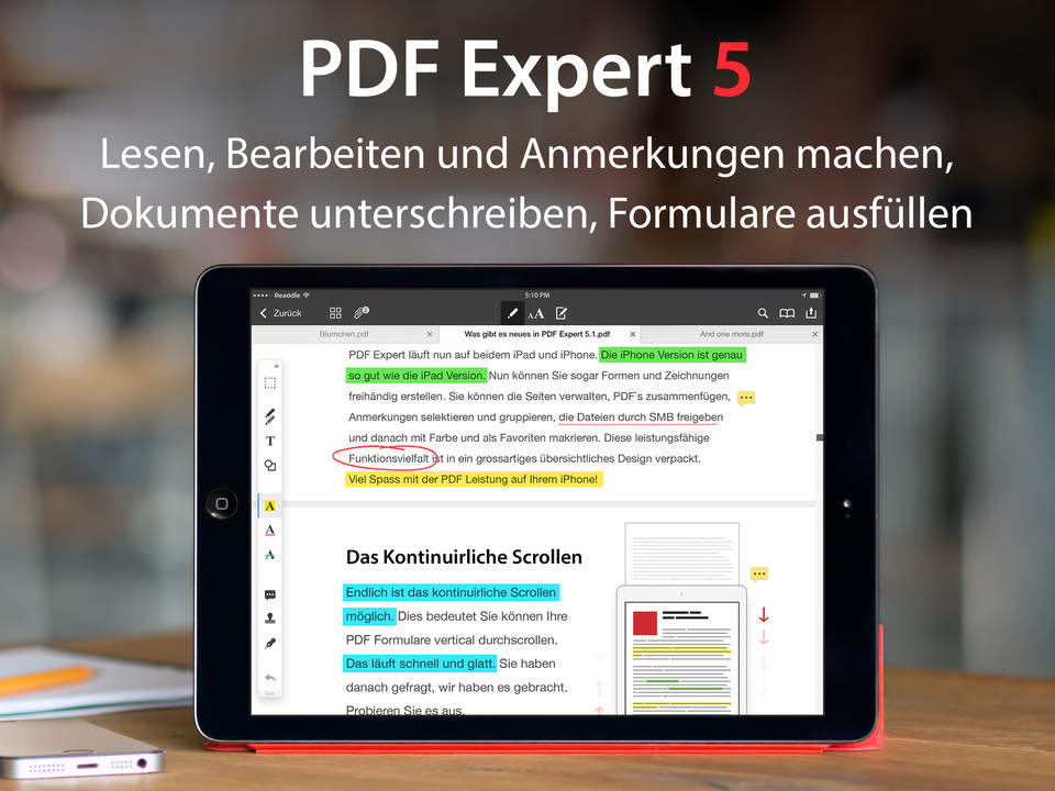 Die wohl bekannteste Readdle-App, PDF Expert 5 (App Store-Link), die aktuell zum Preis von 9,99 Euro im deutschen App Store erhältlich ist, wird mit dem Update auf Version 5.5.0 die neuen Features von iOS 9 unterstützen. Mit Spotlight können nun auch in PDF Expert gespeicherte Dateien gefunden werden, zudem kann auf dem iPad Multitasking ausgeführt werden, um die App in Split View zusammen mit anderen Apps anzeigen zu lassen. Zudem umgesetzt wurden für das PDF-Bearbeitungs-Tool neue Zeichenwerkzeuge, bessere Mechanismen, um Dateien zusammen zu führen und ein sparsamerer Umgang mit Speicherplatz.