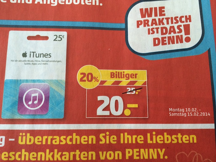 In der Supermarkt-Kette gibt es vom 21. bis 26. September einen Bonus beim Kauf einer iTunes-Karte im Wert von 25, 50 oder 100 Euro. Das Bonus-Guthaben wird als kleiner Gutscheincode auf den Kassenzettel aufgedruckt und kann ganz normal im iTunes Store oder App Store eingelöst werden. Die nächste Penny-Filiale in euerer Nähe findet ihr auf dieser Webseite.