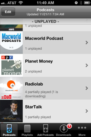 Natürlich gibt es auch dafür Apps. Eine davon ist zum Beispiel Instacast (App Store-Link), ein gerade einmal 2,6 MB großes Tool zur Verwaltung der eigenen Podcasts. Das 1,59 Euro teure Programm wird ständig aktualisiert und hat sein letztes Update erst Anfang des Monats erhalten. Von den Nutzern gibt es derzeit volle fünf Sterne.