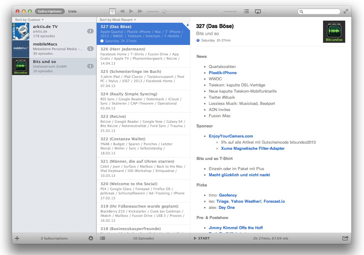 Wer schon auf iPhone und iPad auf Instacast setzt, kann über einen Cloud-Sync alle schon eingetragenen Podcast-Episoden in die Mac-Version transferieren – natürlich lassen sich auch neue Podcasts eintragen und anhören. Vom Funktionsumfang sind beide Versionen sehr ähnlich, natürlich ist das Layout auf dem Mac deutlich übersichtlicher.