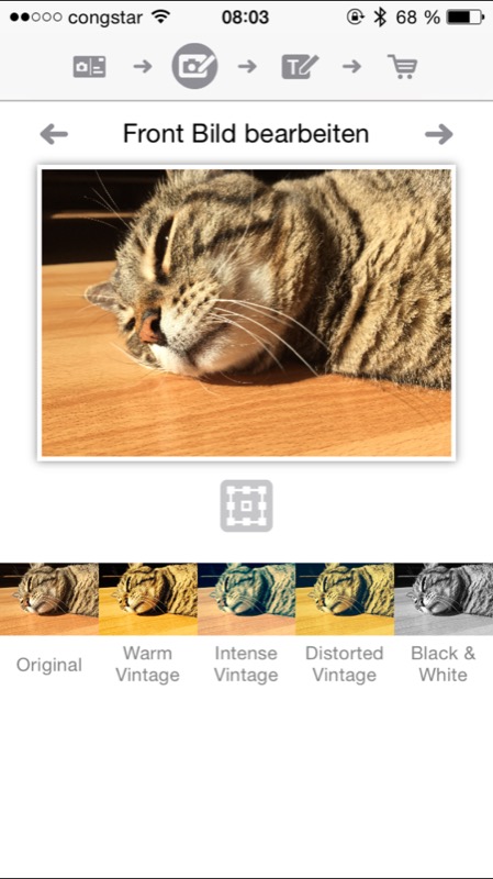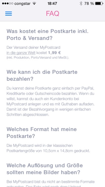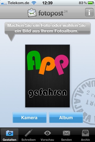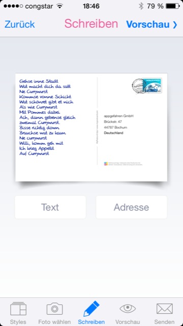 Anfangs sucht man sich entweder ein schon vorhandenes Bild aus dem eigenen Fotoalbum aus oder man nimmt direkt ein neues auf, um den aktuellen Moment festzuhalten. Danach werden ein paar Zeilen, maximal 17, eingetippt und ein netter Gruß verfasst. Bei der Texteingabe wurde leider das Querformat gesperrt, so dass man nur im Portrait-Modus einen Text eingeben kann. Jetzt fehlt nur noch die Adresse und schon kann die Postkarte hochgeladen und bezahlt werden. Danach ist das Team von fotoservice24 gefragt: Der Auftrag wird entgegen genommen, das Bild auf die Karte gedruckt und danach macht sich die Karte auf den Weg zum Empfänger.