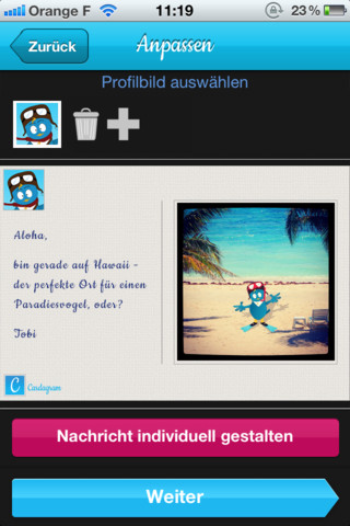 Doch mit der Postkarten-App hat man eine Karte schnell erstellt und schnell versendet. Das iPhone hat man so gut wie immer mit dabei und zwei Minuten finden sich sicherlich, um eben eine Postkarte in die Heimat zu senden. Dabei ist der Aufbau und die Bedienung der etwas mehr als 1 MB großen Applikation intuitiv. Schritt für Schritt wird dem Nutzer klar gemacht, was er machen muss, damit die Karte ein Erfolg wird.