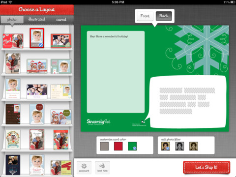 Mal wieder eine App mit langem Namen: „Holiday Cards by Sincerely Ink: Christmas, New Year & Hanukkah cards too!“ (App Store-Link) ist seit knapp zwei Wochen im App Store vertreten und kann kostenlos auf das iPhone oder iPad geladen werden. Im Gegensatz zu Apples Card-App handelt es sich um eine Universal-App, die auf auf dem Tablet genutzt werden kann.