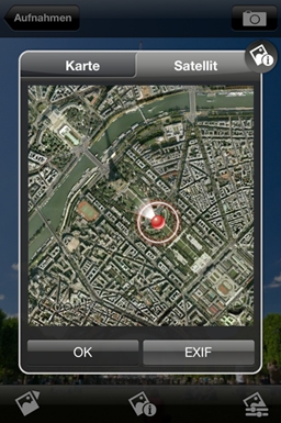Die App nutzt die Kompass-Funktion des iPhones, um nicht nur den aktuellen Standort des Fotografen zu speichern, sondern auch seine aktuelle Blickrichtung. Diese Geokodierung erlaubt es den Besitzern des Fotos später, sich den Ort der Aufnahme auf einer digitalen Karte anzuschauen, etwa auf Google Earth, auf Panoramio, bei Flickr und sogar bei MobileMe.