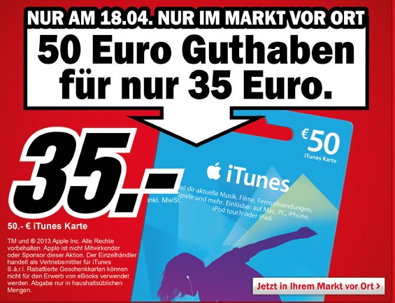 Nur am Donnerstag, den 18. April 2013, gibt es in Media Markt-Filialen einen satten Rabatt. Per Newsletter hat man Kunden in ganz Deutschland über die anstehende Aktion informiert: Es gibt iTunes-Karten im Wert von 50 Euro für nur 35 Euro. Das macht immerhin einen Rabatt von 30 Prozent, das ist deutlich mehr als üblich.