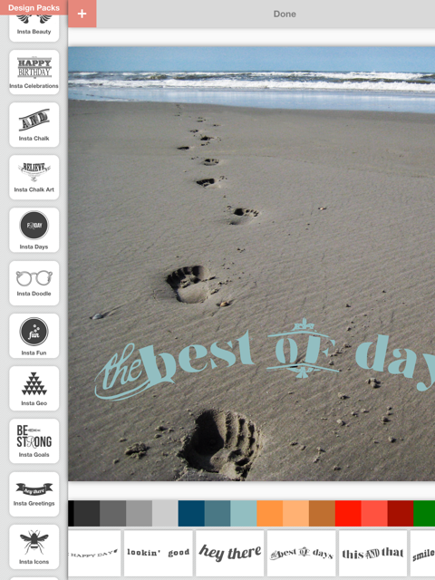 Mit Rhonna Designs kann man seinen Fotos einen kreativen, persönlichen Touch geben, indem man verschiedene Filter, Masken, Rahmen sowie Badges und inspirierende Sprüche auf das eigene Bild anwenden kann. In der App selbst findet man nicht nur Werkzeuge zum Zuschneiden und farblichen Standardanpassungen des Fotos, sondern auch die Möglichkeit, aus einem riesigen Arsenal von Stickern, Bannern und Sprüchen das eigene Bild zu verschönern. Diese können in verschiedenen Farben, Transparenzen und in frei wählbaren Größen auf dem Display platziert werden.