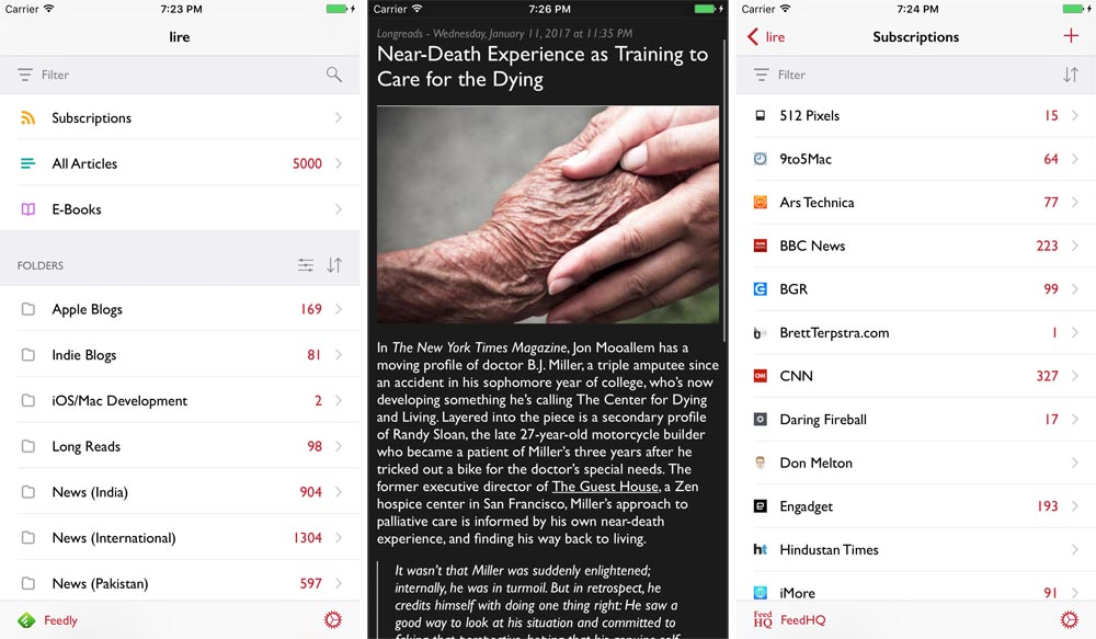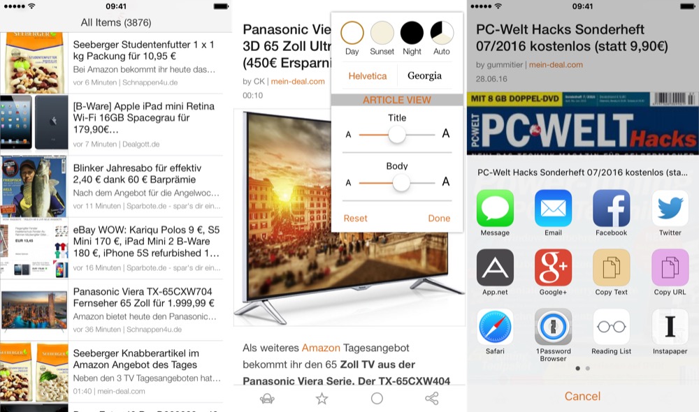 Ab sofort sind nun auch alle Anzeigen, Schaltflächen, Buttons und weiteres in iOS 7-Optik vorhanden. Weiterhin haben die Entwickler eine Option integriert, so das sich die abonnierten Nachrichten nach Anbieter sortieren lassen, auch können unter iOS 7 Artikel mit einem langen Klick direkt an die Safari-Leseleiste gesendet werden.