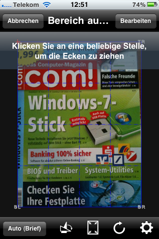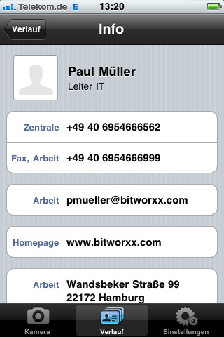 Die kleine 1,2 MB App bitCard ist kein herkömmlicher Visitenkarten-Scanner, sondern hier erfolgt die Erkennung noch manuell. Hinter bitCard sitzen Mitarbeiter, die die eingesendeten Visitenkarten nach dem 4-Augen-Prinzip von Hand erfassen.