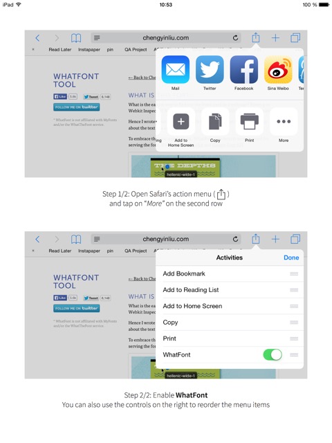 WhatFont muss vor der eigentlichen Nutzung zunächst auf dem Gerät bzw. im Safari-Browser eingerichtet werden. Nach dem Download findet man eine entsprechende Anleitung auch direkt in der App. Zunächst gilt es, den Safari-Browser aufzurufen und den Menü-Button („Quadrat-mit-Pfeil“-Symbol) am oberen rechten Bildschirmrand zu betätigen. Dort sucht man nach dem „Mehr“-Button und wählt dann in der auftauchenden Liste „WhatFont“ aus, und aktiviert den Eintrag über den iOS-üblichen Schieberegler.
