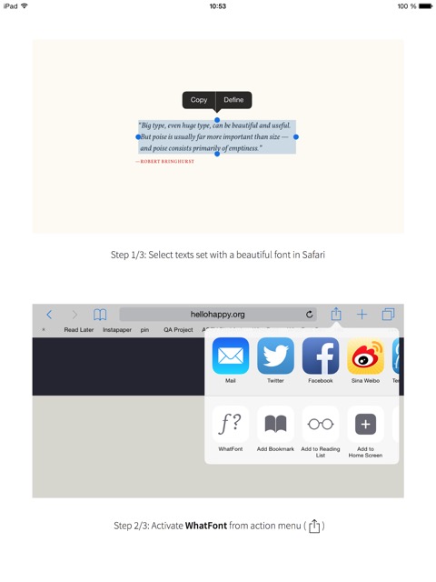 WhatFont (App Store-Link) ist eine kleine, kostenlose Universal-App für iPhone, iPod Touch und iPad. Schon seit längerem kann man über eine Desktop-Browser-Variante von WhatFont Gebrauch machen, seit Oktober dieses Jahres lässt sich die Anwendung nun auch auf mobilen Apple-Geräten nutzen. Die 13,6 MB große App erfordert zur Installation mindestens iOS 8.0 und steht in englischer Sprache bereit.